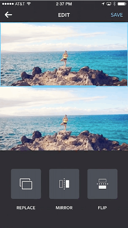 As opções de edição permitem espelhar, virar, aumentar ou reduzir o zoom, substituir as imagens e etc. Após criar o seu layout você pode salvar a sua nova imagem e compartilhar no Instagram combinando com os filtros da rede.